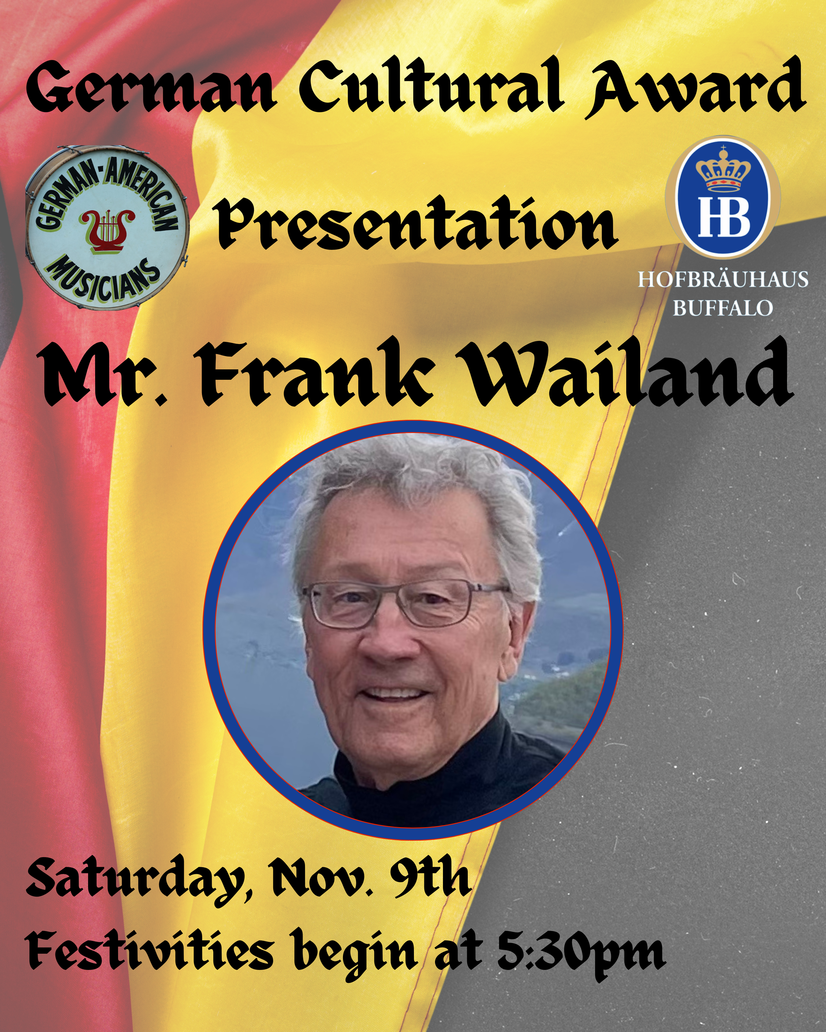 Join us on November 9th at Hofbrauhaus Buffalo for a special evening celebrating the life journey of Frank Wailand, recipient of the German Cultural Award. The night will feature live music from the German American Musicians, honoring Frank’s outstanding commitment to German culture and community. From his beginnings in 1956 as a Schuhplattler with SGTV Edelweiss to his lifelong role as a musician, designer, and cultural ambassador, Frank’s story is an integral part of Buffalo’s German heritage.