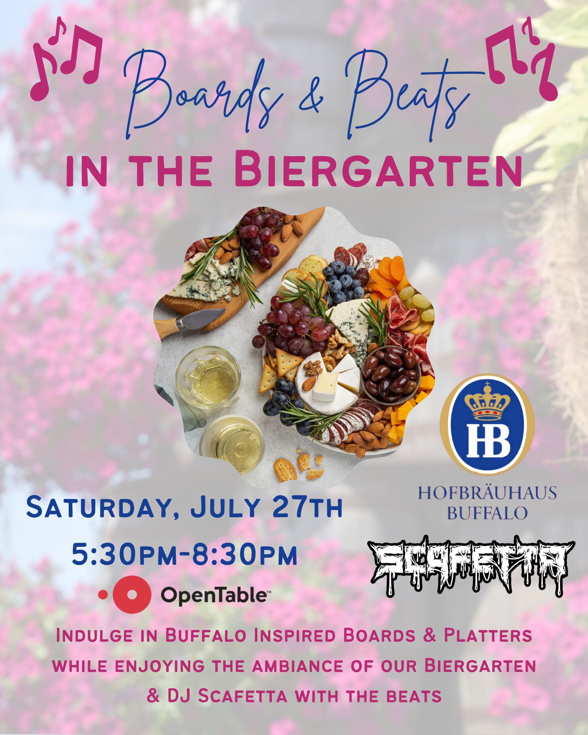 Get ready to indulge in Buffalo inspired food boards and platters while enjoying the lively ambiance of our Biergarten and the beats from DJ Scafetta!