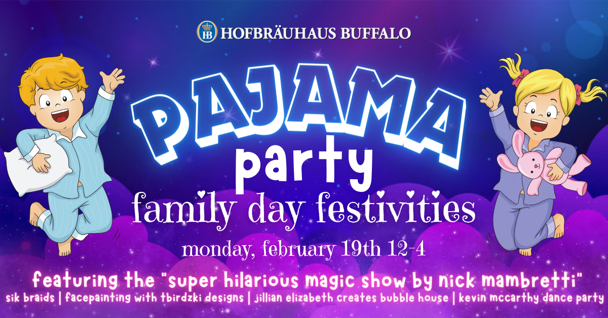 Join us on Monday, February 19th for our next family day pajama party! You heard that right: you get to wear your pajamas to Hofbräuhaus Buffalo! Dining will start at 11 am, with activities starting at 12.