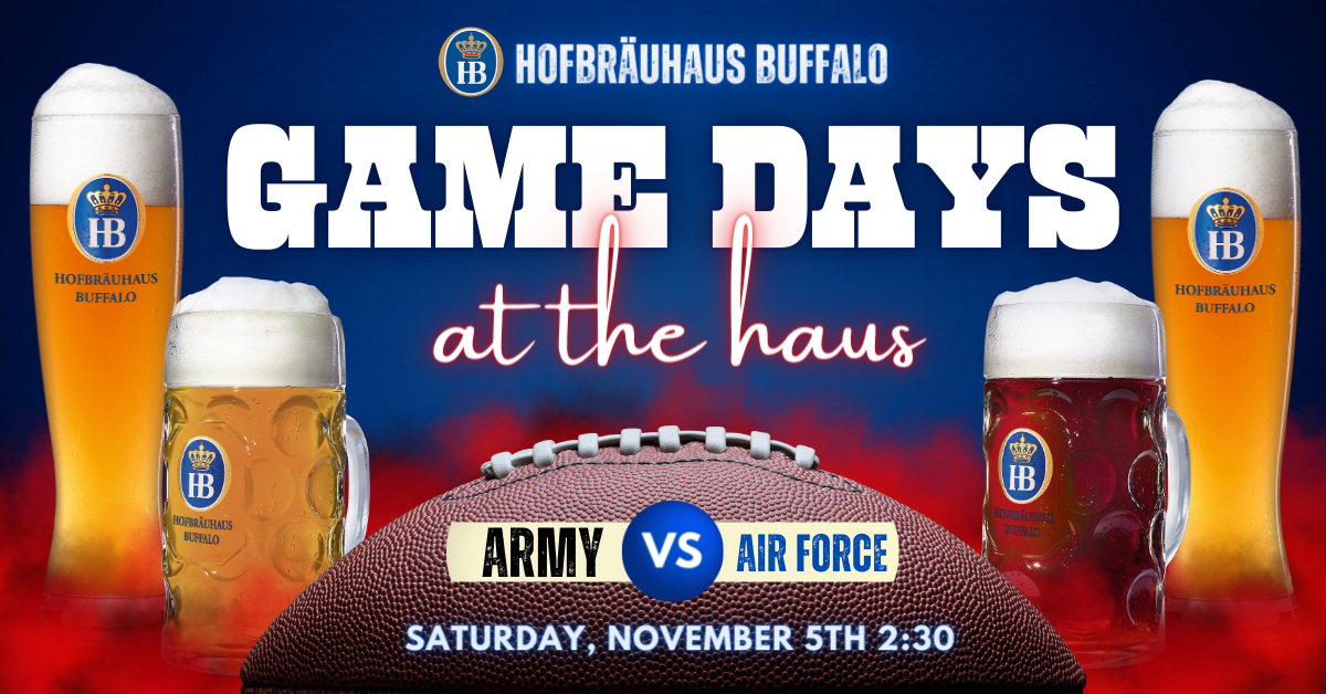 Catch the Army Black Knights take on the Air Force Falcons this Saturday at 2:30 pm! All ages are welcome. For reservations, please visit www.hofbrauhausbuffalo.com or call us at (716) 939-BEER (2337).