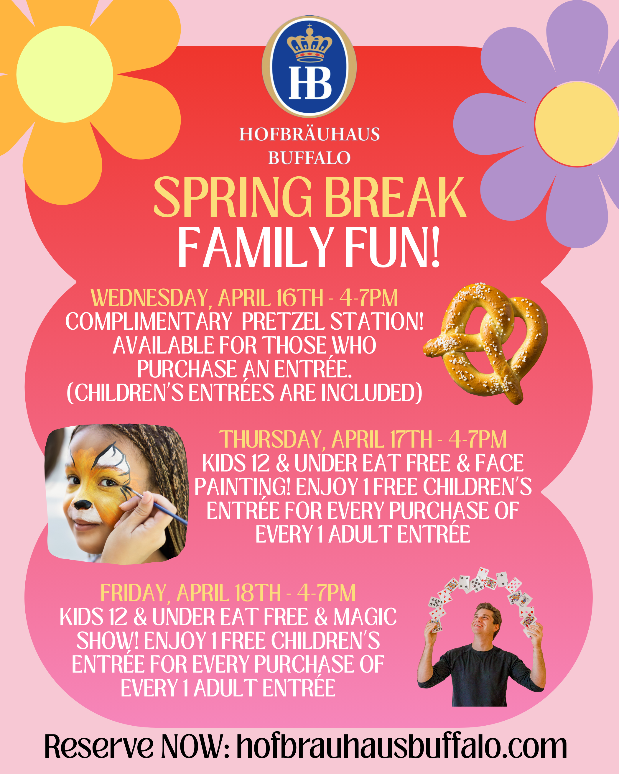 Kids 12 & under eat FREE! FREE Children’s entrée with the purchase of an adult entrée! Come on down and get you face painted!